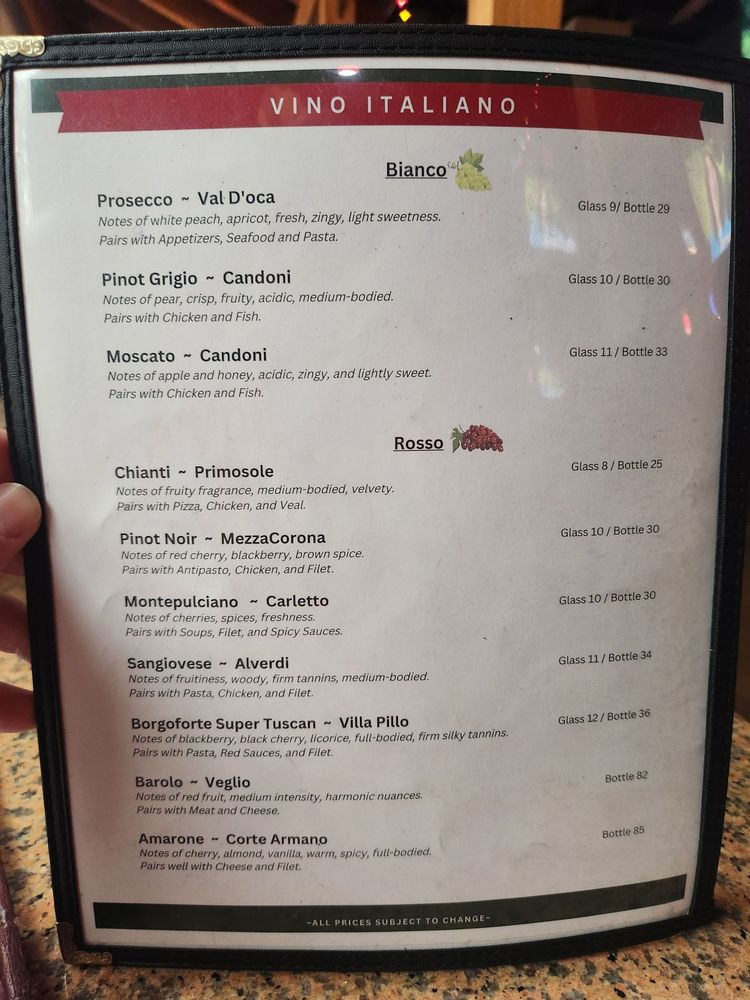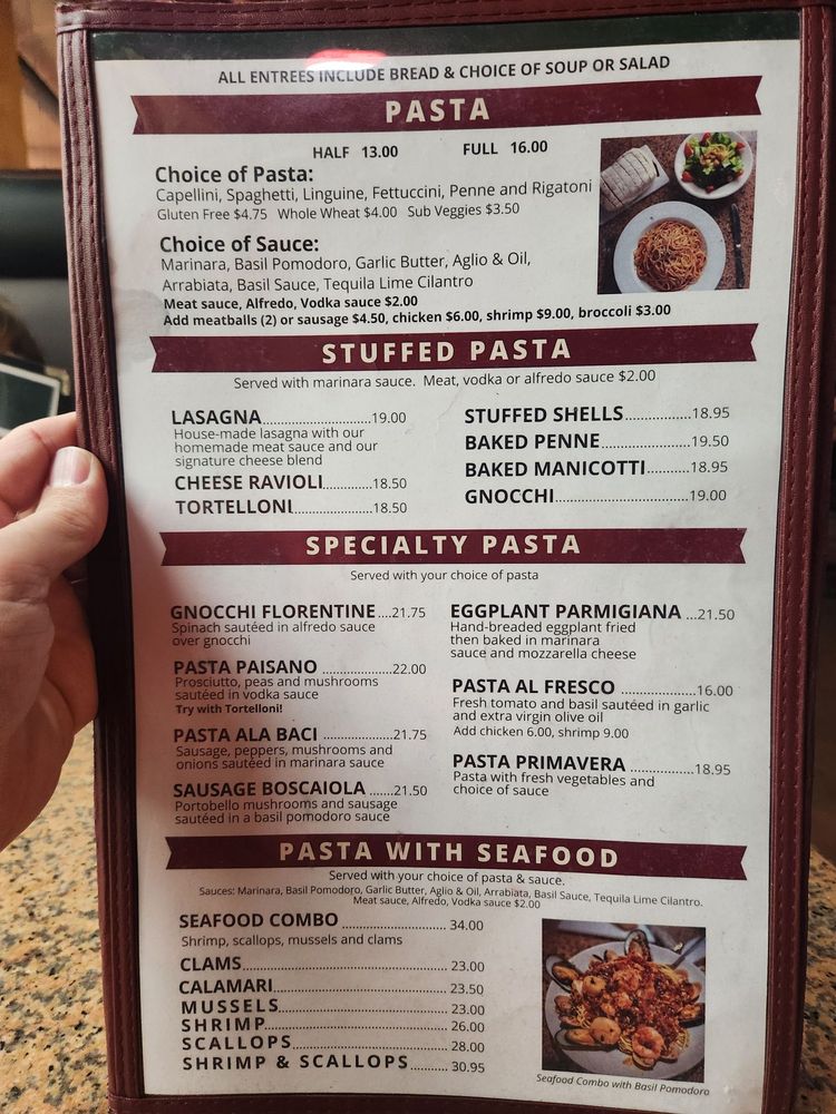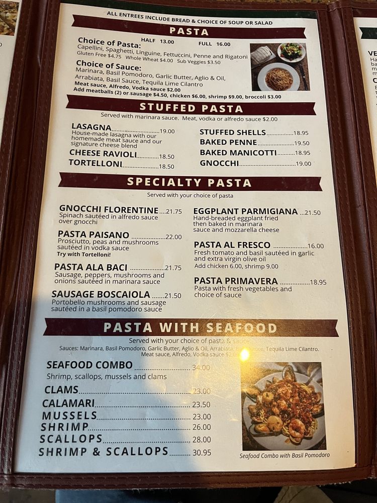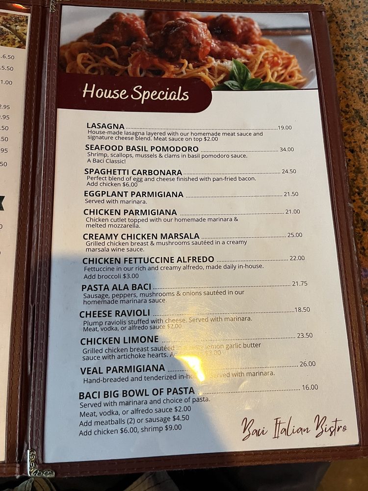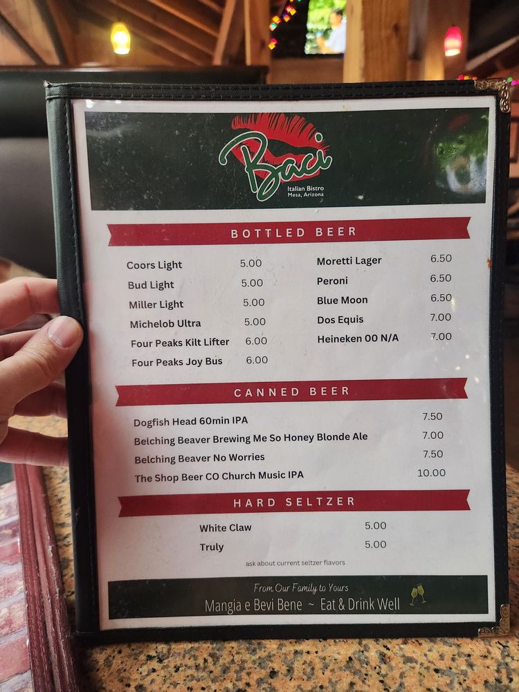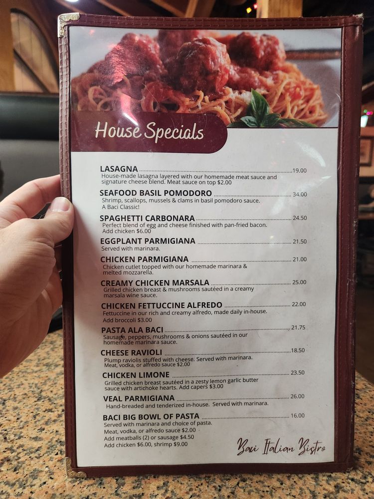 Introducing the menu at Baci Italian Bistro, a cozy spot in Mesa, AZ, serving up delicious pizza, authentic Italian dishes, and fresh seafood. From their homemade bread to their savory sauces, each dish is made with care and attention to detail. With amenities like outdoor seating, full bar, and wheelchair accessibility, Baci Italian Bistro caters to a wide range of diners. Customers rave about the generous portions, friendly service, and overall enjoyable dining experience. Whether you're looking for a quick meal to-go or a sit-down dinner, Baci Italian Bistro is a great choice. Don't miss out on their homemade tiramisu or classic Chicken Parmigiana. With a welcoming atmosphere and flavorful dishes, Baci Italian Bistro is a must-visit for Italian food lovers.